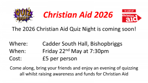 The 2026 Christian Aid Quiz Night is currently being organised. It will be held on Friday 22 May in the Cadder South Halls at 7:30pm with an entry price of £5. Refreshments will be available at half-time. Val Brown, Head of Christian Aid in Scotland, will be coming along to support this event.